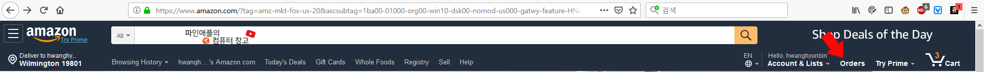 아마존에 접속하시게 되면 오른쪽 최상단 "Orders"를 클릭해주세요