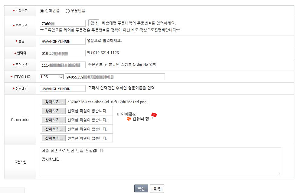 트래킹 넘버는 반품건이 아니라 제품을 받을 때 사용했던 트래킹 넘버를 적으셔야해요!