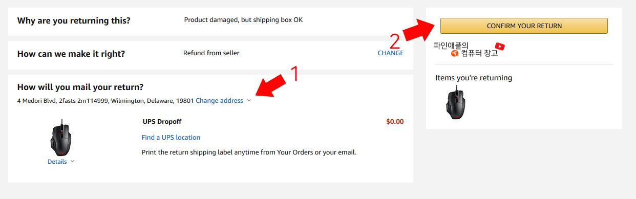 다음 창으로 넘어가면 "1번" 반품주소(배대지)확인 하시고 맞으시면 2번 "CONFIRM YOUR RETURN"을 눌러주세요