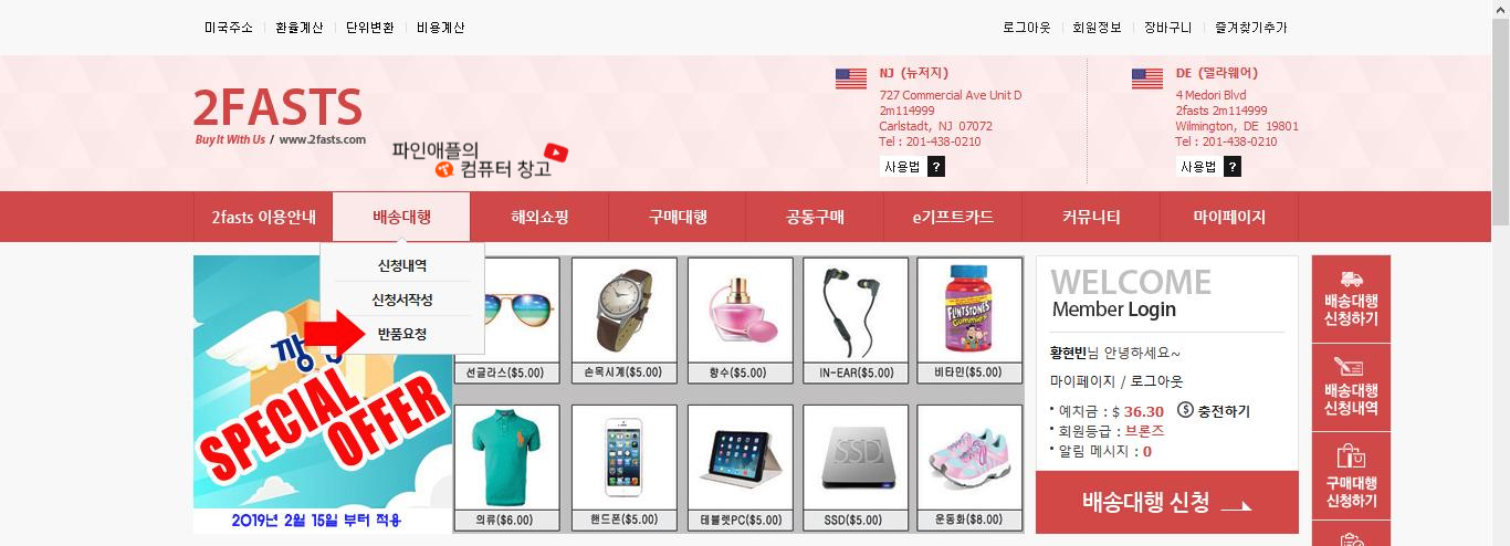 아까 열어두신 투패스츠 메인 창에서 배송대행-> 반품 요청 순으로 클릭해주세요