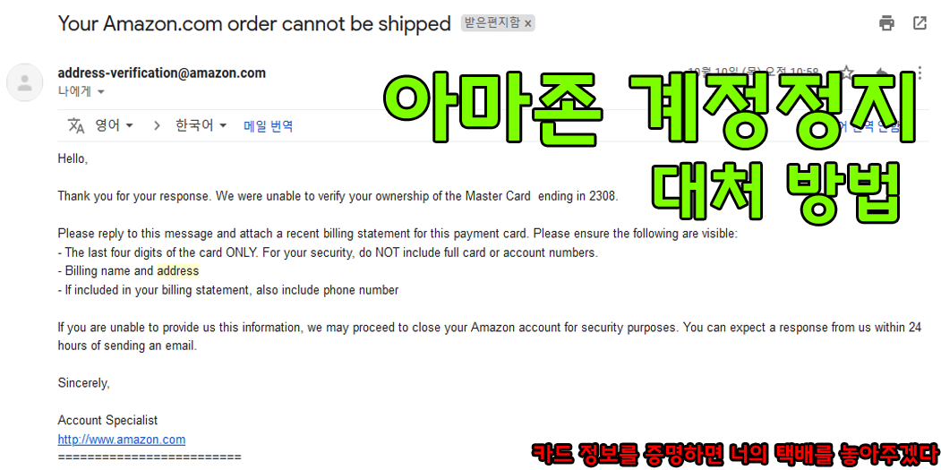 "아마존에서 물건을 구매했는데 본인 카드인지 확인이 안돼서 계정이 정지됐습니다"