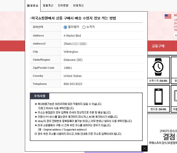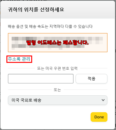 메인화면에서 왼쪽 상단 "미국주소"를 클릭하시면