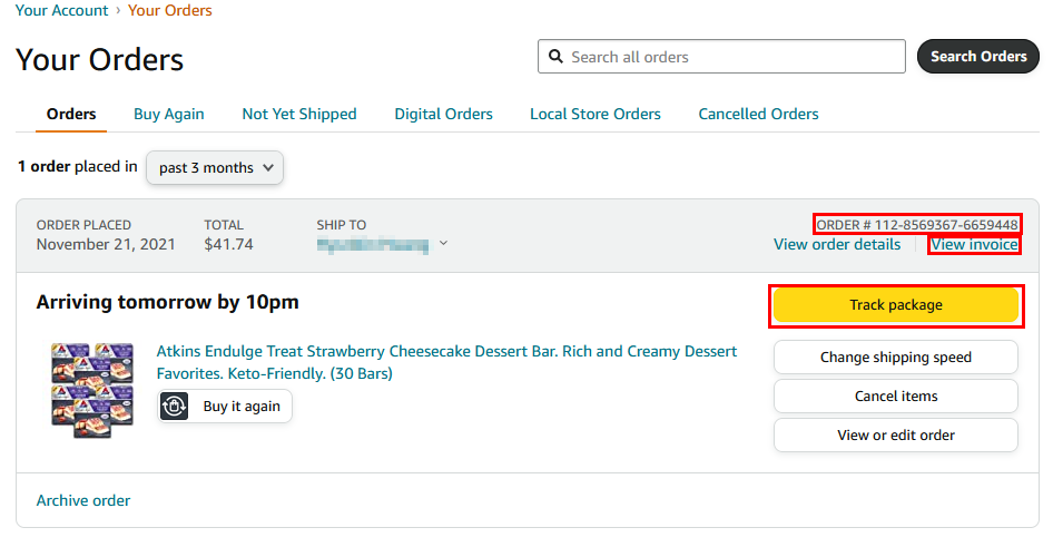 주문내역에서 "Track package"라 적힌 노란 버튼을 클릭하시면 운송장 번호가 나옵니다.