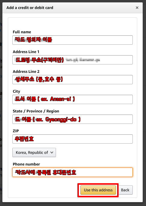 제일 아래 주소는 택배를 받으실 한국 주소를 입력해주세요
