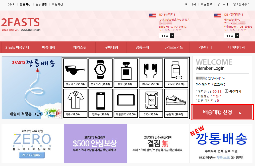 다시 투패스츠 메인으로 오셔서 오른쪽에 '배송대행 신청'을 클릭해주세요