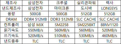 각 SSD의 성능 및 정보는 위 표로 정리해두었습니다.