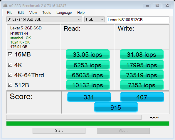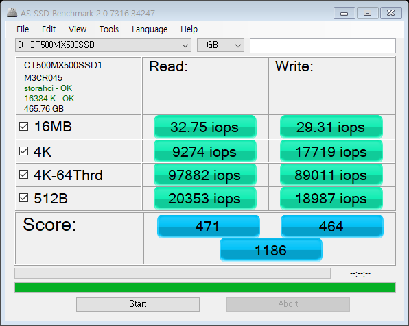 데이터 입출력 속도를 보는 AS SSD Benchmark입니다.