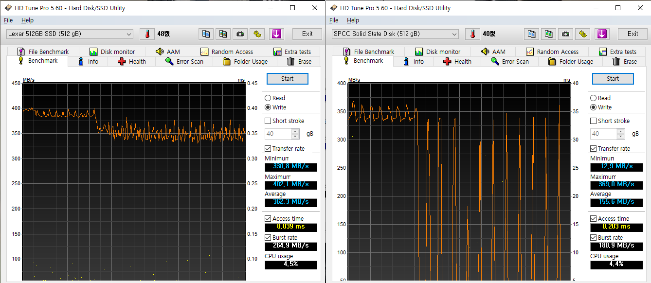 없는 경우 쓰기 속도에 변화가 생겨 렉사의 경우 다소 튀지만